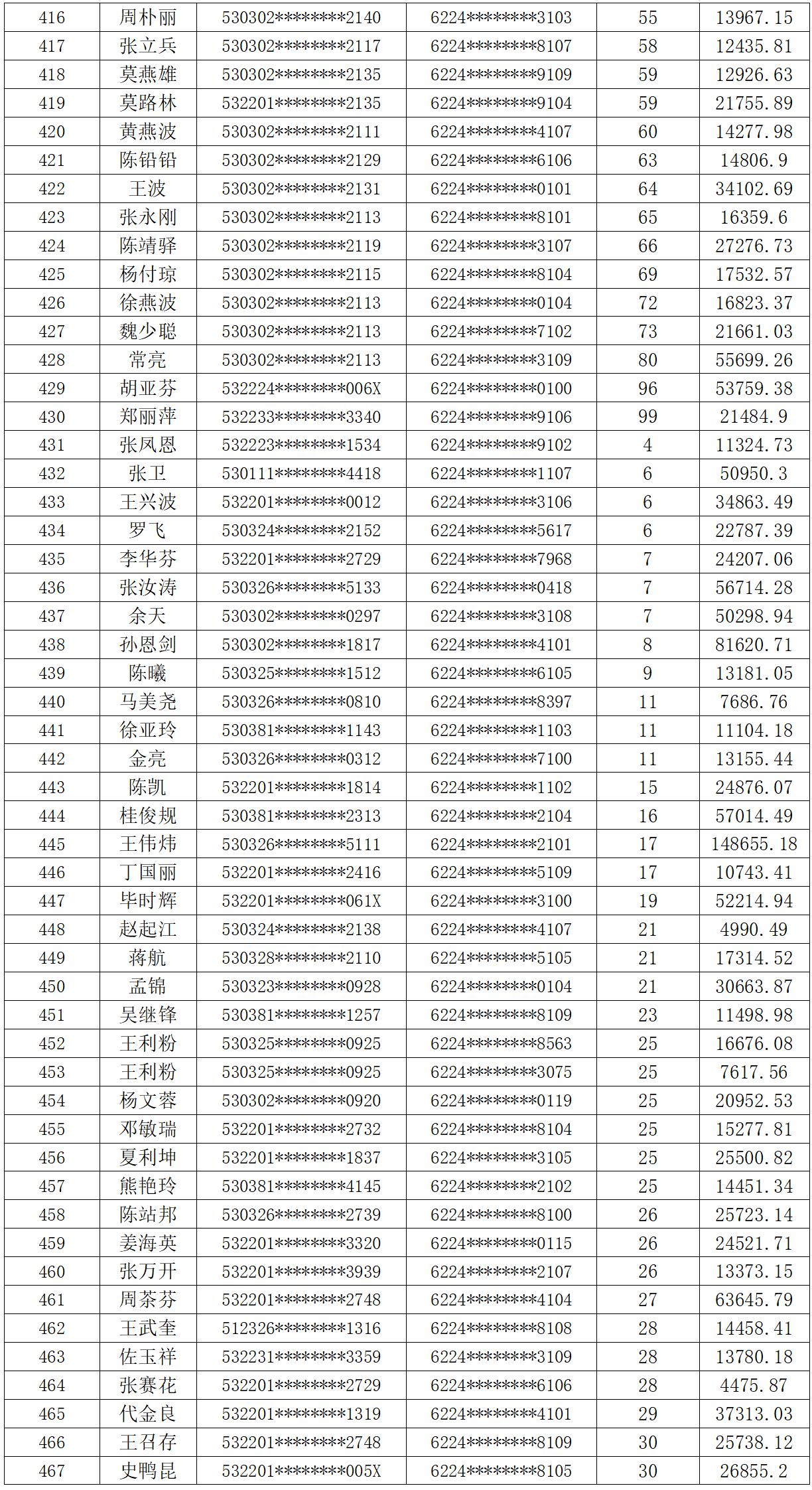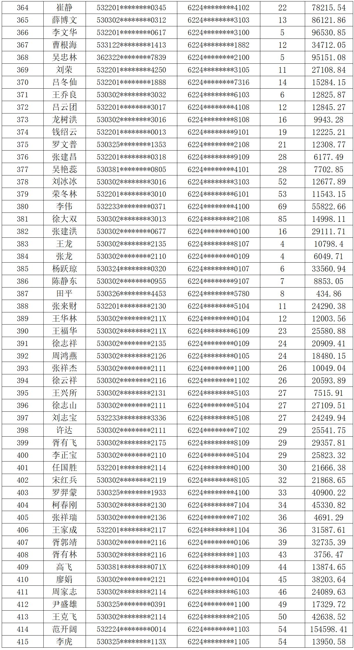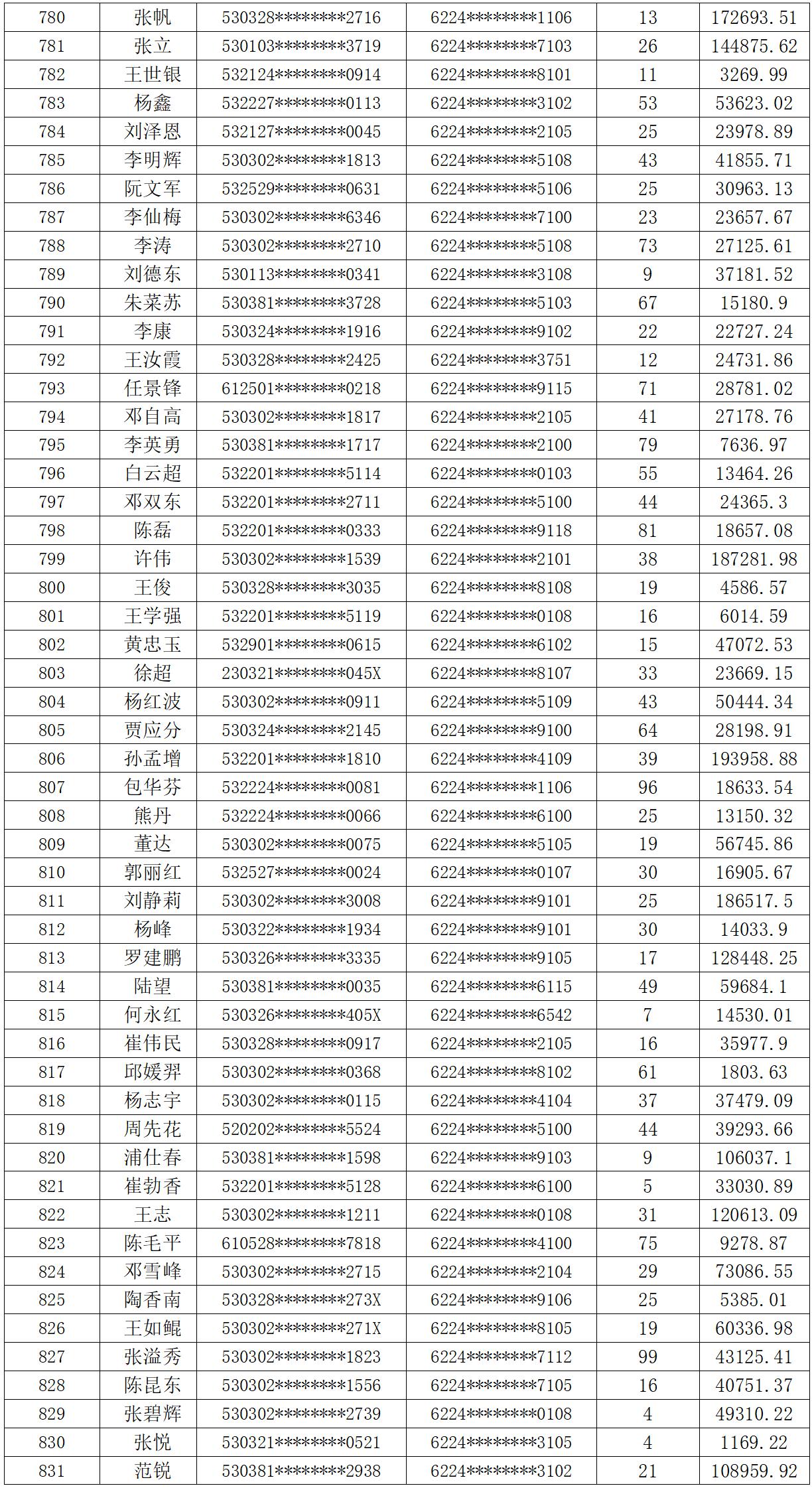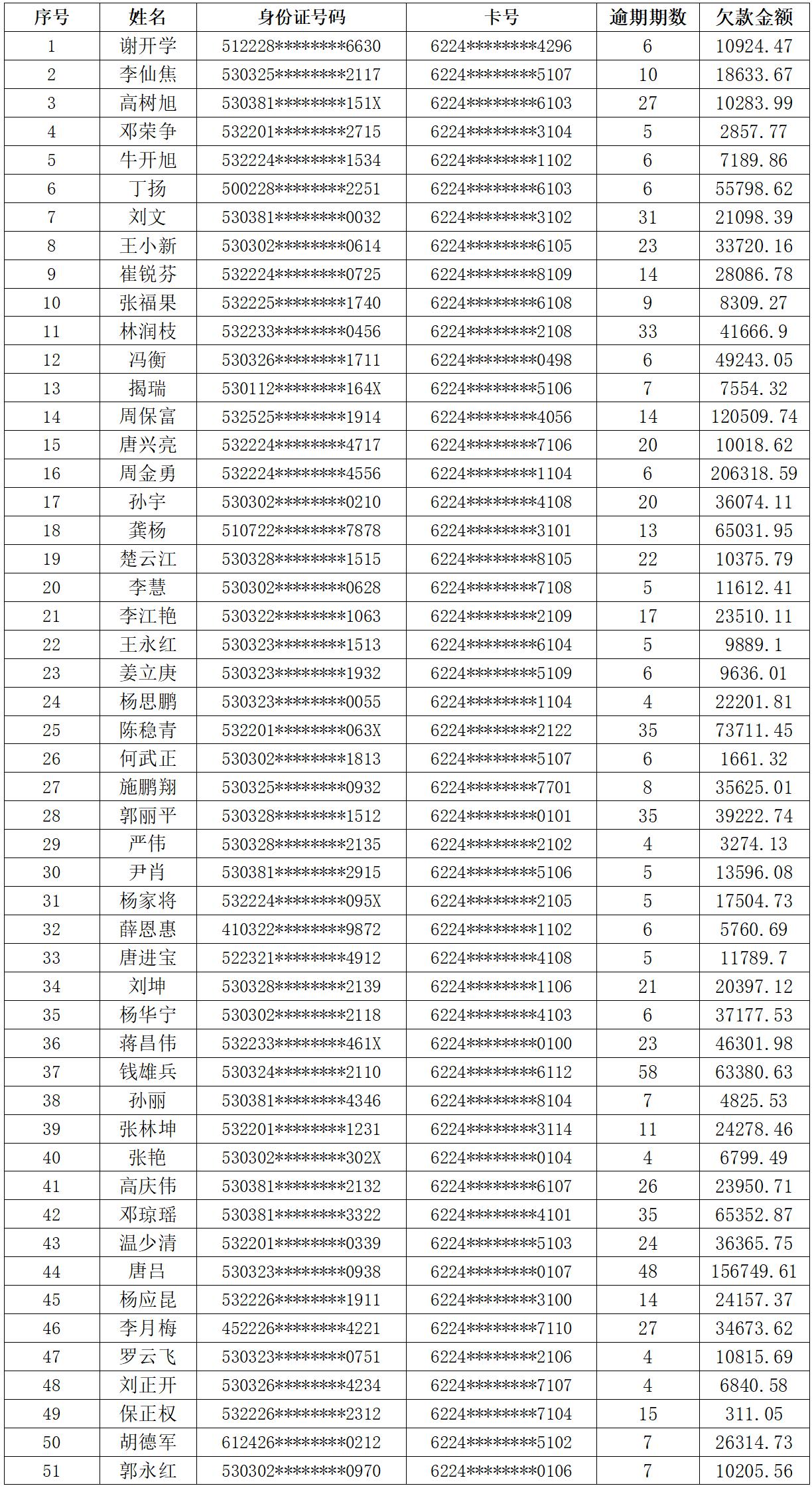 以下人员在曲靖市麒麟区农村信用合作联社办理贷记卡,截止2025年8月17日,已逾期4期(含)以上,具体欠款金额见下表,现予以公告催收。请以下人员自公告之日起15日内,向本社清偿下述逾期债务及公告之日起至实际清偿之日止的逾期债务。对拒不履行者,我社将依据有关规定,向公安机关报案或向人民法院提起诉讼。