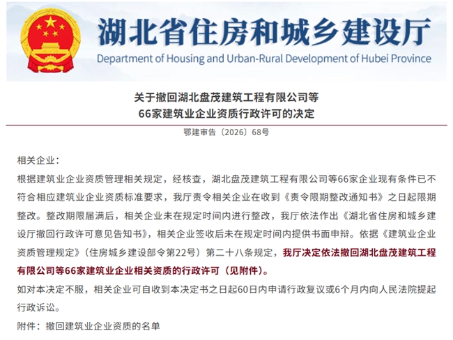 决定显示,湖北省住建厅依法向企业下达《责令限期整改通知书》后,相关企业在规定整改期限内未能完成有效整改,且未在法定期限内提出合法有效的申辩理由。住建厅因此依据《建筑业企业资质管理规定》第二十八条相关要求,依法作出撤回资质的行政决定。